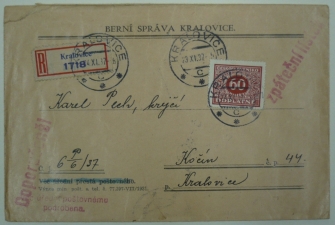R zásilka Berní správy Kralovice do Kočína, razítko KRALOVICE 23.XI.37, úřední záznamy, doplatní známka 60h; zajímavé