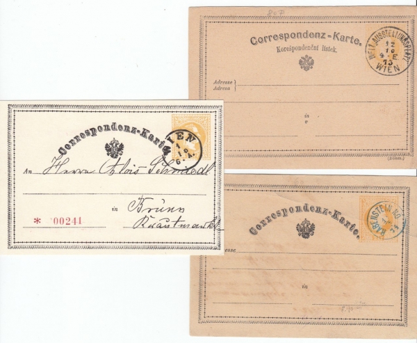 1873 Rakousko, sestava 3 dopisnic 2Kr "žluťásek"