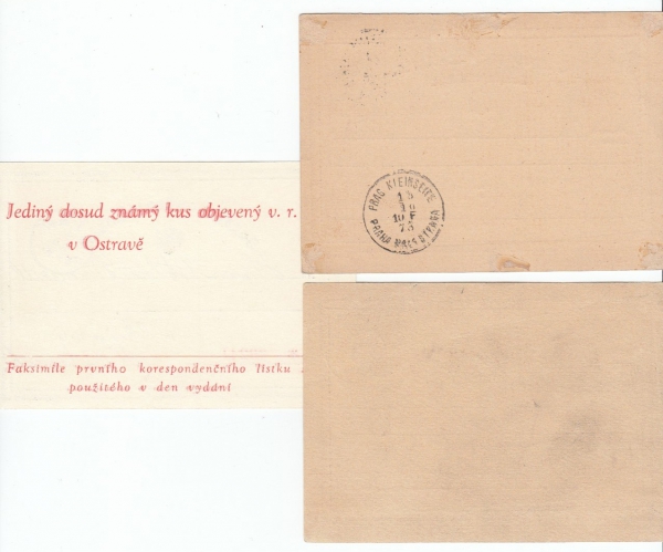3D, modré razítko RABENSTEIN N.Ö./ 19.3.74, katalog 60 bodů (vyšisovaný text a lom), 4D, WIEN/ AUSSTELLUNGPLATZ/ 12.10.73 z ochoty, katalog 80 bodů + faksimile nejstarší dopisnice na světě adresovaná do Brna, použitá v den jejího vydání jako pozvánka na filatelistickou výstavu OSTRAVA 1980; pěkný stav