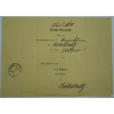 Militärfahrkarte, sestava 2 formulářů pro jízdu z Vídně do Jilemnice a z Jilemnice do Wieselburgu, staniční razítka WIEN a JILEMNICE-MARTINICE; odpovídající stav