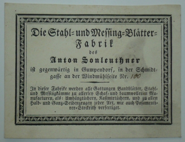 vizitka na jméno Anton Sonleuthner, Gumpendorf; zajímavé