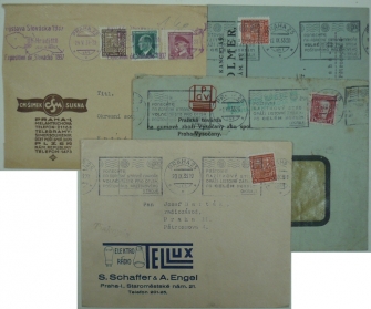 Maxa P11, perfin PG/V, identifikační celistvost, lehká patina; sestava 4 dopisů s reklamními razítky