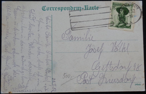 pohled ke kostelu, v popředí muž, prošlá v r. 1952 v Rakousku, Q2