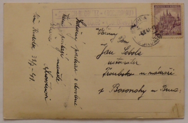 foto Knoll, poštovna DEUTSCH RUDOLETZ (BOCHDALAU)/ NĚMECKÝ RUDOLEC (BOHDALOV), razítko BOHDALOV 4.IX.41; Q2