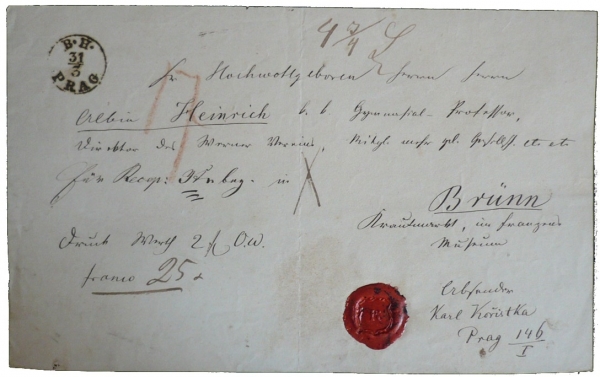 zaplacená zásilka od Karla Kořistky z Prahy do Brna Albínu Heinrichovi z Františkova muzea, cena 2 zlaté a 3/4 lotu, poplatek 25Kr