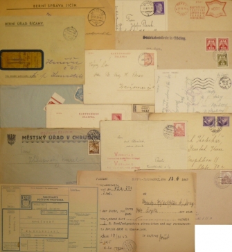 sestava 15 celistvostí, obsahuje mj. frankotyp, novinové známky, R služební dopis, kašek Viktoria!!/ Vítězství!!, razítko vlakové pošty, vzorec, 2 zálepky a pohlednice ze Sudet