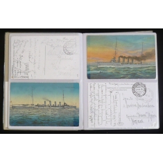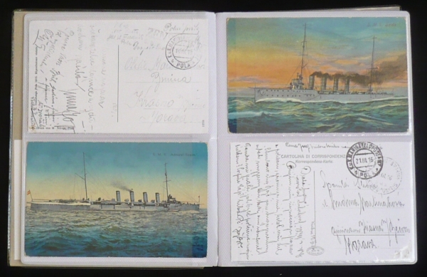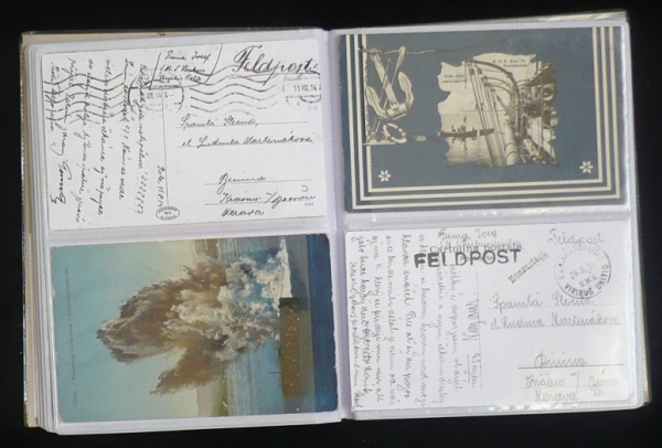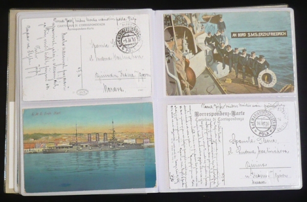 sbírka korespondence vojáka z Moravy, který sloužil na lodi VIRIBUS UNITIS, období 28.5.1914-29.5.1918, razítka a cenzury z různých lodí, převážně VIRIBUS UNITIS, ale také pohlednice s námětem lodí, psáno česky, zajímavý příběh, mj. mimořádně vzácná pohlednice s veslaři z brněnského Jundrova; vše uloženo ve 2 zásobnících, na požádání možno zaslat další fotografie, lze si vyžádat osobní prohlídku v Brně nebo v Praze; velmi zajímavé!!
