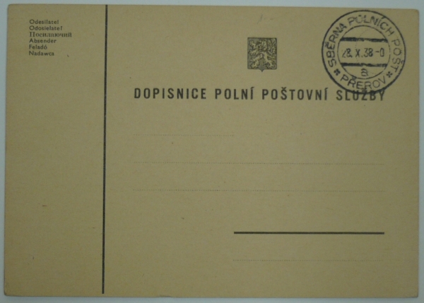 dopisnice polní pošty s razítkem 28.X.38