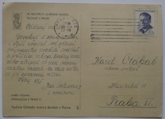 český malíř, pohlednice s podpisem adresovaná akad. sochaři Karlu Otáhalovi; hezké