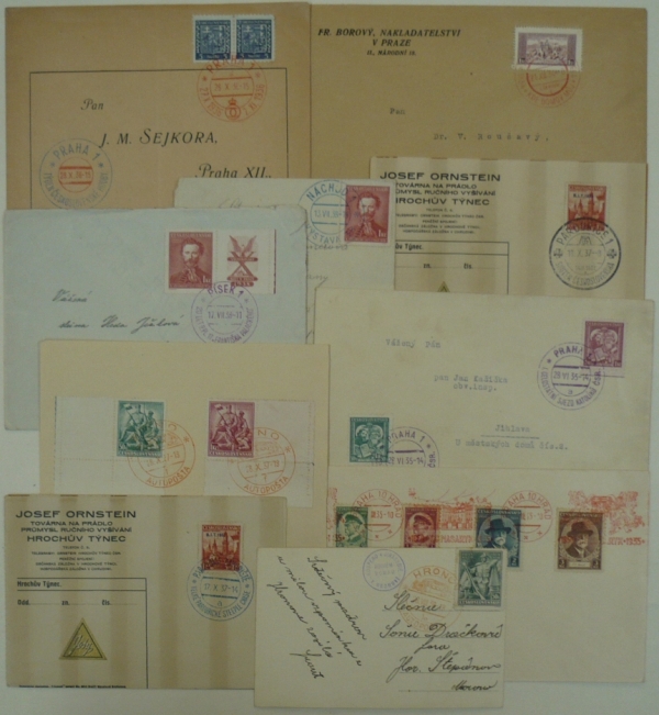 mj. AUTOPOŠTA BRNO a HRONOV, SJEZD KATOLÍKŮ PRAHA, PARDUBICE ZÁVODIŠTĚ, PÍSEK, NÁCHOD, frankatura Kde domov můj? s razítkem KDE DOMOV MŮJ aj.