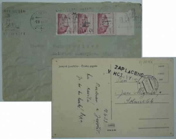 pohlednice PLACENO V HOTOVOSTI s podacím razítkem SLAVĚTÍM U LITOVLE 11.VI.53 a dopis s reklamním strojovým razítkem BRNO 9.VI.53; dopis - pomačkaný papír