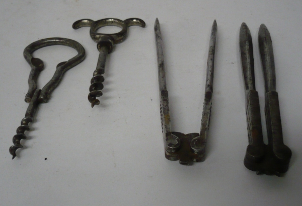 Sestava 2 louskáčků na ořechy a 2 vývrtek; patina