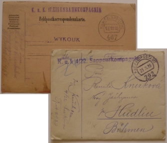 útvarová razítka K.u.K. 17. EISENBAHNKOMPAGNIE a K.u.K. 4/22. SAPPEURKOMPAGNIE; standardní kvalita