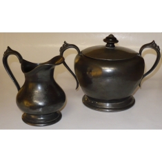 dóza s víčkem a konvička, výška obou asi 9cm, průměr dózy 10cm