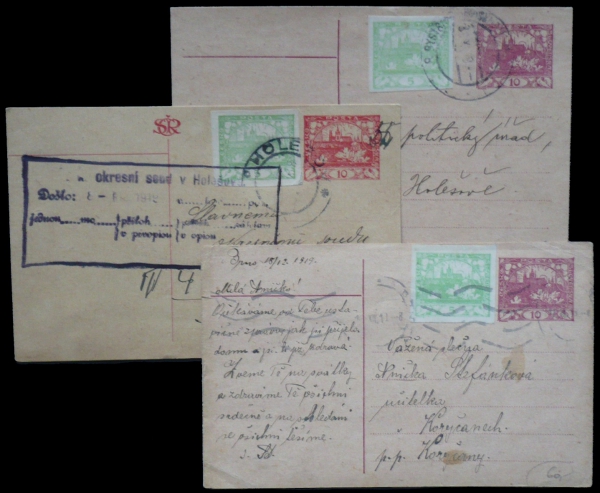 sestava 3 dopisnic Hradčany 10h, dofrankované známkami POFIS 3, Hradčany 5h zelená; dobrý stav