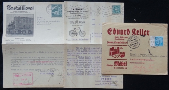 3x obchodní zásilka s přítiskem firmy a obrázkovou reklamou, VIGOR Opava, SMÉKAL Litovel, E. KELLER Znojmo