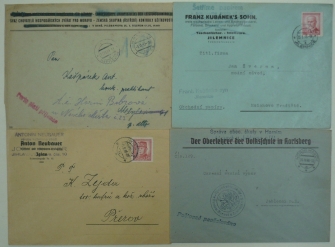 přeškrtnuté německé texty, provizorní texty v češtině, vylámaná razítka, 2x platba v hotovosti; zajímavé