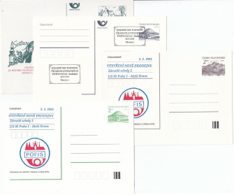 a) CDV239, Říp 2 Kčs zelená + CDV240, Kriváň 2 Kčs šedá, obě s přítiskem "Otevření nové prodejny Pofis"; b) CDV3A, Říp 2 Kč, přítisk "Poslední den platnosti čsl. známek/ 30.9.1993"; c) CDV5, Lada 3 Kč, přátisk "Svitavy/ Celostátní finále 22. ročníku filat. olympiády mládeže"; bezvadné