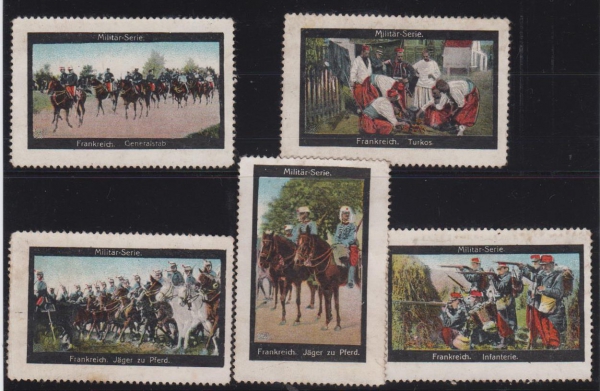 1910 Sestava 5 propagačních nálepek - vojáci, uniformy