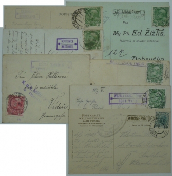 z toho 5x z českého území: PLANÁ (BŘASY), KŘEMEŠNÍK, NOUTONICE, SEBRANICE (MOR.) a LEŠTINA (ZÁBŘEH 2) s razítkem vojenské cenzury; k tomu MOSERBODEN A WILHELM EICHERTHÜTTE; hezky čitelné otisky