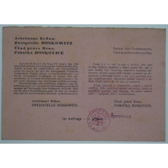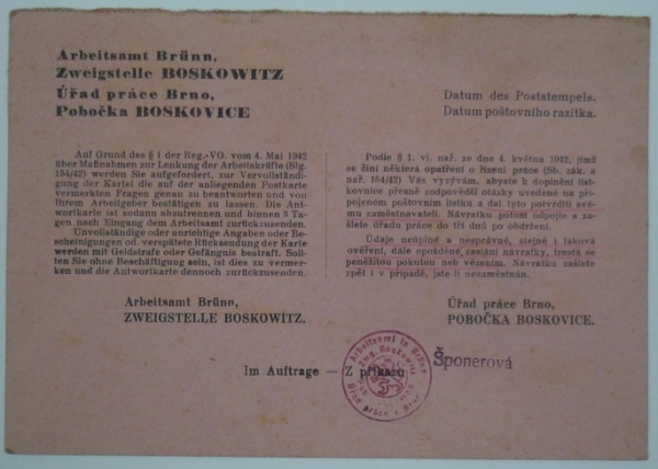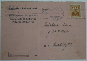 služební lístek se známkou SL13, BOSKOVICE 5.VIII.44; velmi lehké skvrny