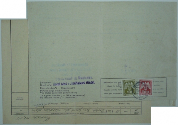 kompletní formulář s frankaturou SL 19 a SL 22; úřední razítka a záznamy