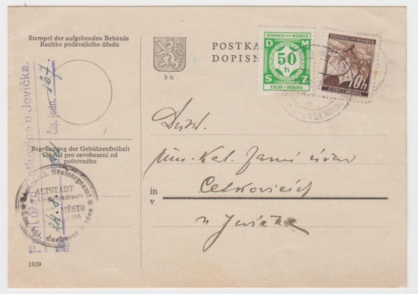 korespondenční lístek na farní úřad Cetkovice u Jevíčka, smíšená frankatura výplatní a služební známky, STARÉ MĚSTO U UHERSKÉHO HRADIŠTĚ 21.VIII.42; velmi vzácné