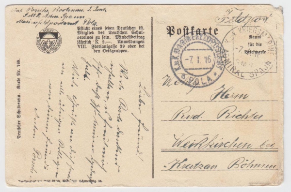 propagační pohlednice s razítkem K.u.K. KRIEGSMARINE/ S.M.S. ADMIRAL SPAUN 7.I.16, typ 2a, 200-500 bodů