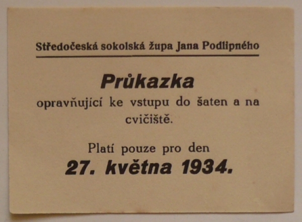 Sokol - průkazka ke vstupu do šaten a na cvičiště 27.5.1934, Středočeská sokolská župa Jana Podlipného
