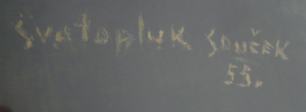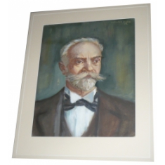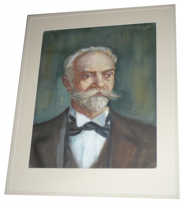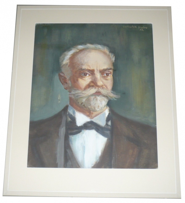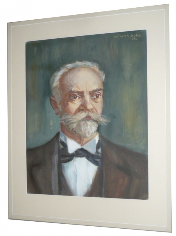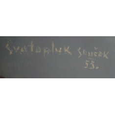 studie k velkému portrétu, mistrovský olej - tempera, signováno vpravo nahoře SVATOPLUK SOUČEK, datováno 1955, vzadu uveden název díla, adjustováno pod sklem, rámováno textilním olepem, 52,5 x 42,5 (69 x 57) cm. Svatopluk Souček (*13.9.1902 Přerov), malíř, studoval v Praze u profesora Nechleby, dále v Paříži a Itálii, maloval portréty a žánrové obrazy, portrétoval řadu významných osobností své doby. Zemřel 21.8.1986 ve Vyškově. Smluvní doprava.