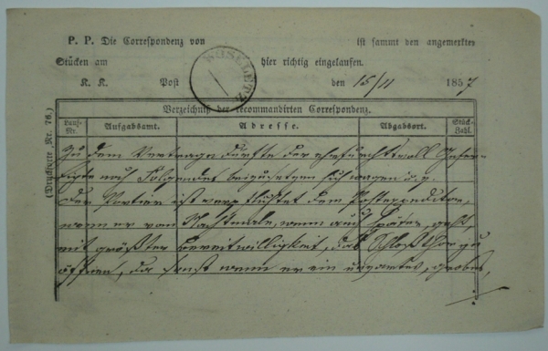 úřední tiskovina Nr.76, seznam doporučených zásilek z 15.11.1857 na poštovním úřadě Oselce (Woseletz, okr. Plzeň), kruhové razítko; vše krásně čitelné, velmi zajímavé