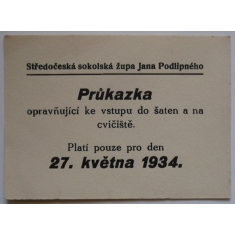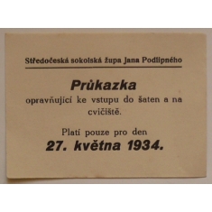 průkazka ke vstupu do šaten a na cvičiště 27.5.1934, Středočeská sokolská župa Jana Podlipného
