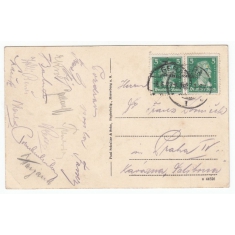 pohlednice (Merseburg) s DR GERA/ 6.6.27, s podpisy méně známých čs. fotbalistů ze zájezdu do Německa, např. Beneš, Fasser, Trenlovský, Špaček a další, celkem 12 podpisů, pěkný stav