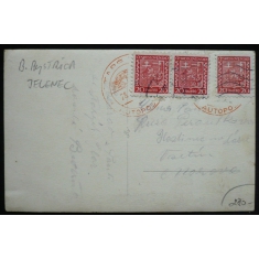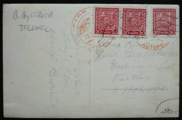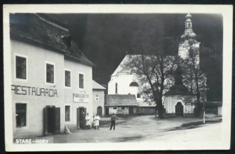 fotopohlednice, restaurace, lidé, Pohronské družstvo, kostel, prošlá, dolepovaná známka, Q2