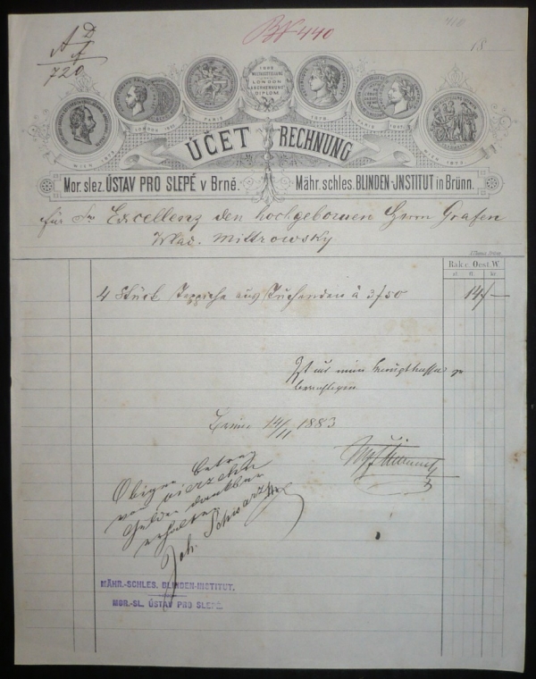 velmi dobře zachovaný účet ústavu se zdobeným záhlavím, signováno Vl. Mitrovský