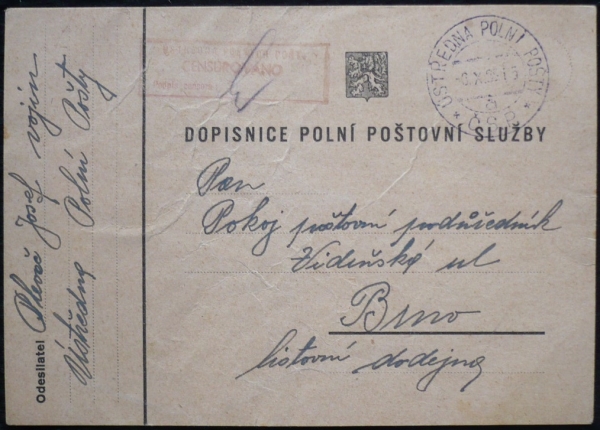1938 ÚSTŘEDNA POLNÍ POŠTY a