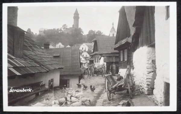 fotopohlednice, ulička, povozy, drůbež, nepoužitá, Q2 - stopy po nalepení