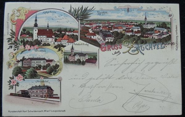 litografická koláž, kostel, škola, nádraží, prošlá, dlouhá adresa, Q2
