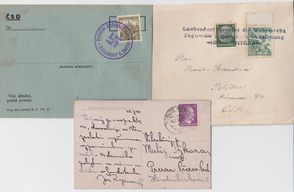 POMEZÍ u Poličky (Laubendorf), 3řádkové razítko: Obec Pomezí (Limberk) vítá Wehrmacht/ Den osvobození/ Heil Hitler, dopis do Poličky se smíšenou čs-německou frankaturou; KOCLÍŘOV (Ketzelsdorf bei Zwittau), dopis s čs. známkou a příležitostným razítkem se svastikou, pohlednice s německou známkou, MÜGLITZ; velmi zajímavá sestava