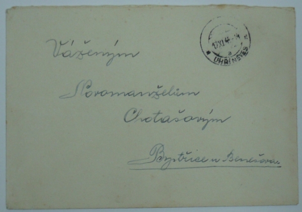 propagační nálepka na obálce dopisu bez frankatury, vylámané razítko UHŘÍNĚVES 17.XI.45; hezké