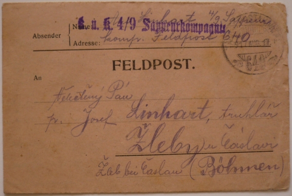 zálepka polní pošty, TPH 17.VIII.17; lehké skvrny
