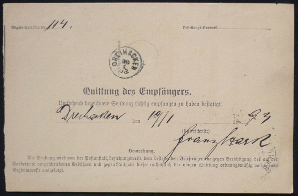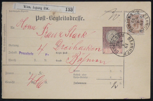 dofrankováno poštovní známkou 30Kr, razítko BAHNHOF WIEN-ASPANG 19/1/93, adresováno na poštovní úřad TŘI SEKERY [DREIHACKEN], hezké náprstkové razítko vzadu