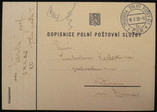 razítko s obráceným "N" - TŘÍDÍRИA, dopisnice polní pošty s razítkem 10.X.38; pochází z rozsáhlé sbírky