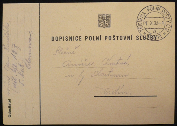 dopisnice polní pošty s razítkem 1?.X.38; pochází z rozsáhlé sbírky