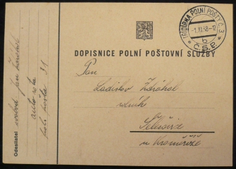 dopisnice polní pošty s razítkem 1.XI.38; pochází z rozsáhlé sbírky