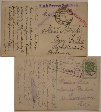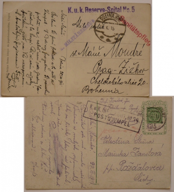K.u.K. RESERVE-SPITAL No.5, podací razítko DOLINA 28.V.15; K.u.K. INFT. RGMT. No.74, FP ?05/ 30.VII.17; hezké