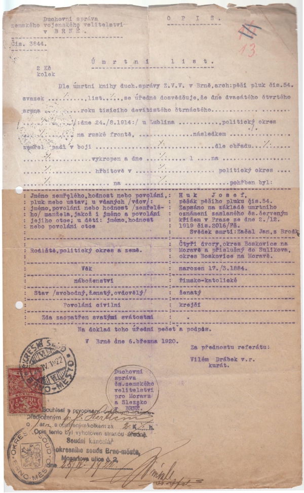 opis úmrtního listu vydaný v roce 1920, kolek 1Kč, velmi zajímavé; výrazný křížový sklad