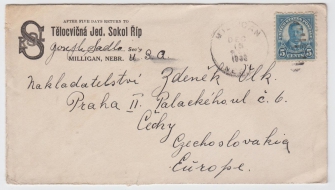 dopis do ČSR s přítiskem Tělocvičná jednota SOKOL Říp, MILLIGAN, Nebrasca, U.S.A., razítko MILLIGAN DEC.16/1936