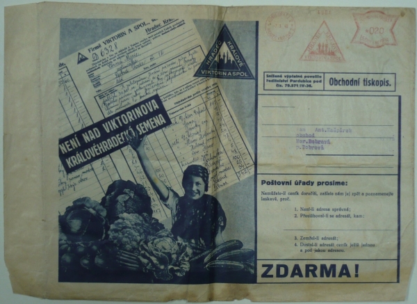 firemní obálka A4, zasláno jako tiskopis, frankováno frankotypem, HRADEC KRÁLOVÉ 7.3.40; přeloženo, poškozeno v dolním okraji