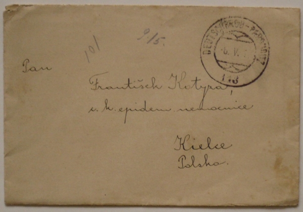 dopis ze Slatiňan bez frankatury do C.k. nemocnice Kielce; zajímavé